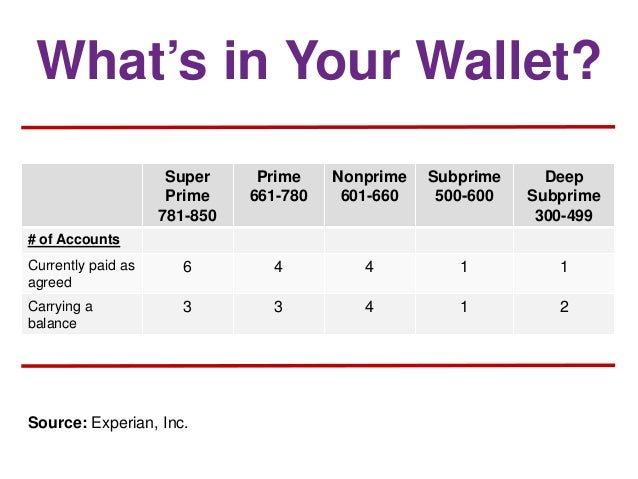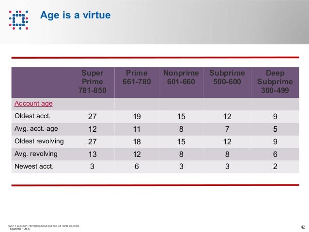 Experian Public. Credit rehabilitation and maintenance • Six key credit score components • Age of accounts • Number of accounts • Revolving account balances 781-850 . Prime 661-780 . Nonprime 601-660 . Subprime 500-600 . Deep ... Read Here